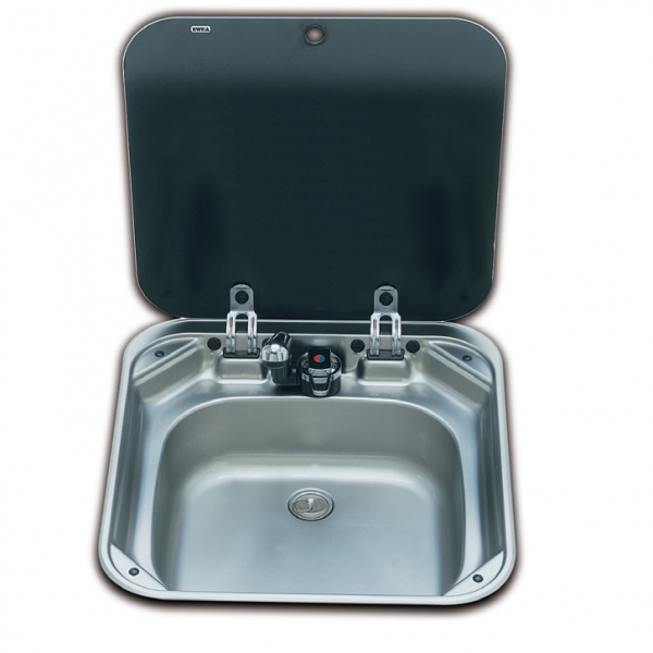Smev 8006 serisi eviye. Paslanmaz çelik. Switch´li musluk ve füme cam kapağa sahiptir.