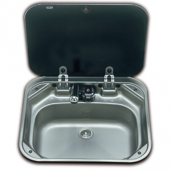 Smev 8005 serisi eviye. Paslanmaz çelik Switch´li musluk ve füme cam kapağa sahiptir.